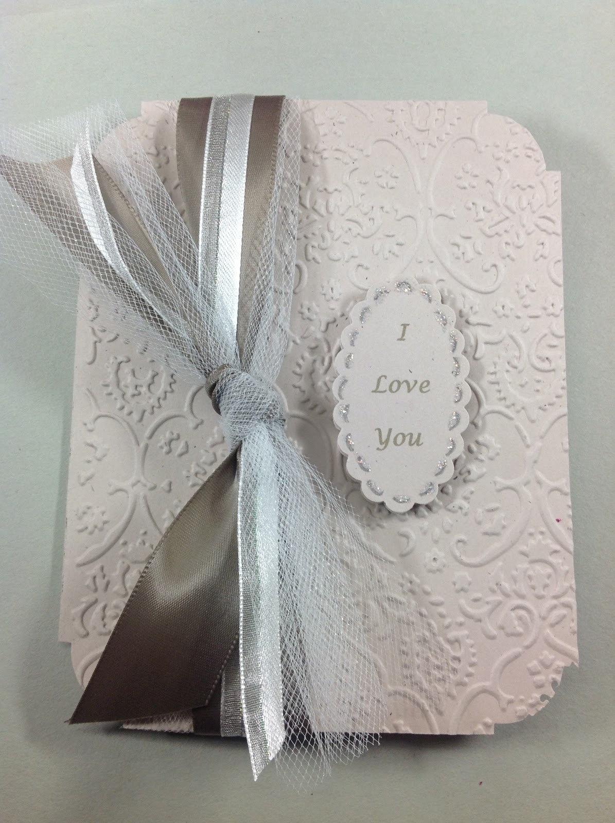 This challenge was fun - to make a card with the theme of "I Love You" using NO RED - along with a 3-D embellishment!